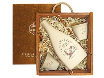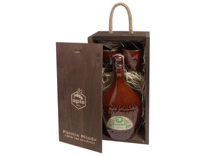 Bottle of mead Klasztorny Dwójniak 0,5 l + 2 cups in wood gift box.