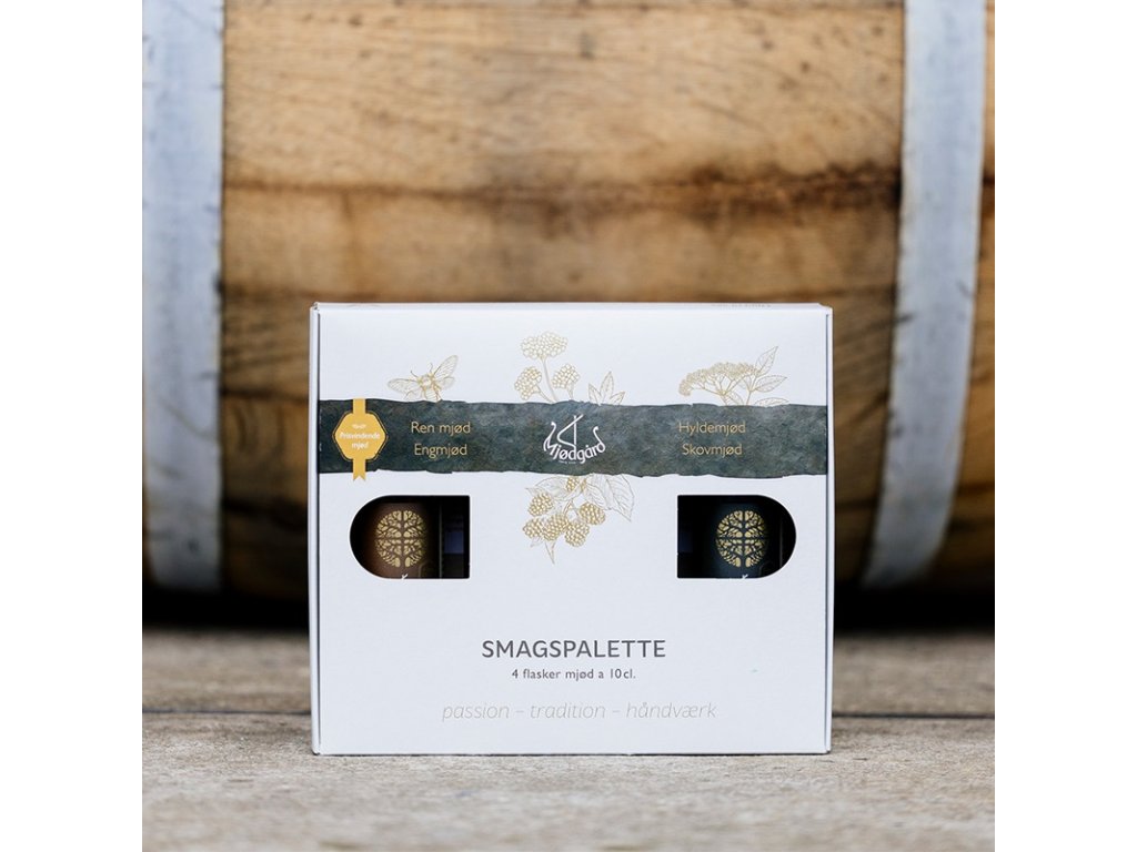 Four meads from the core range of Danish meadery Mjødgård in a gift box. The set includes: Natural mead – Ren Mjød, Meadow mead – Engmjød, Elder mead – Hyldemjød, and Forest mead – Skovmjød.
